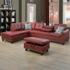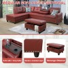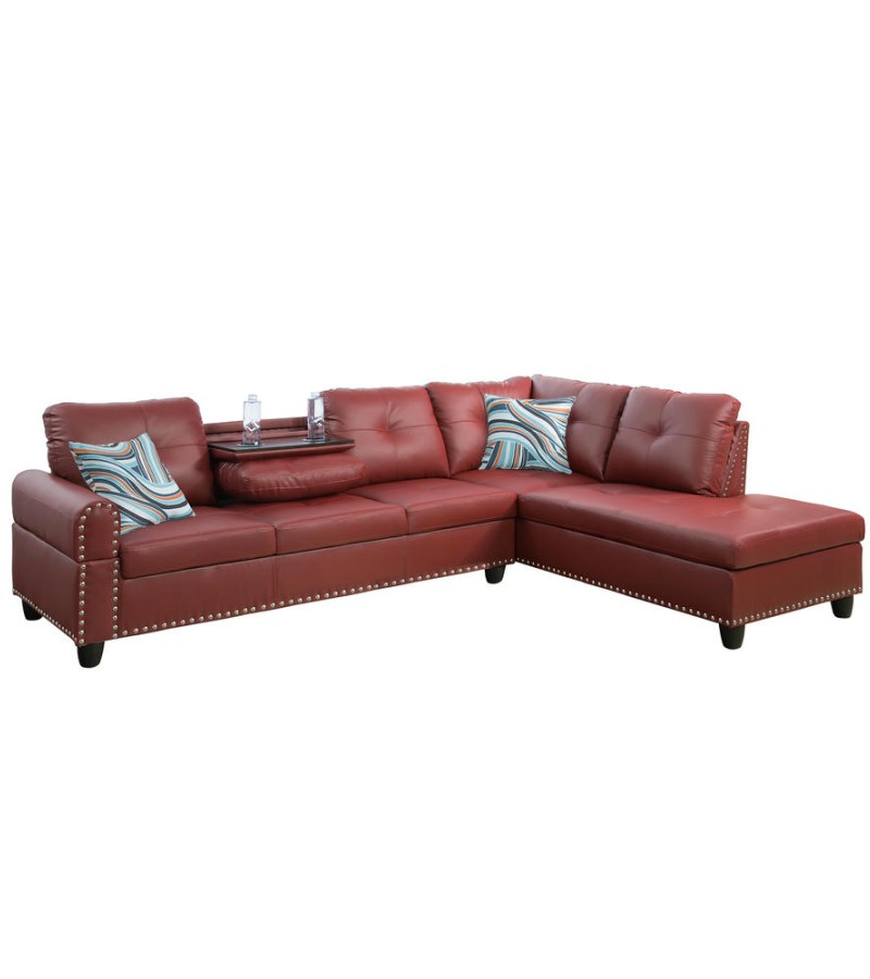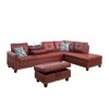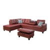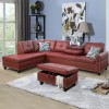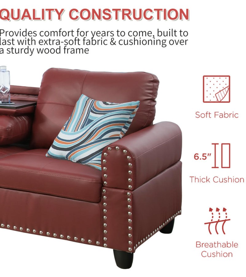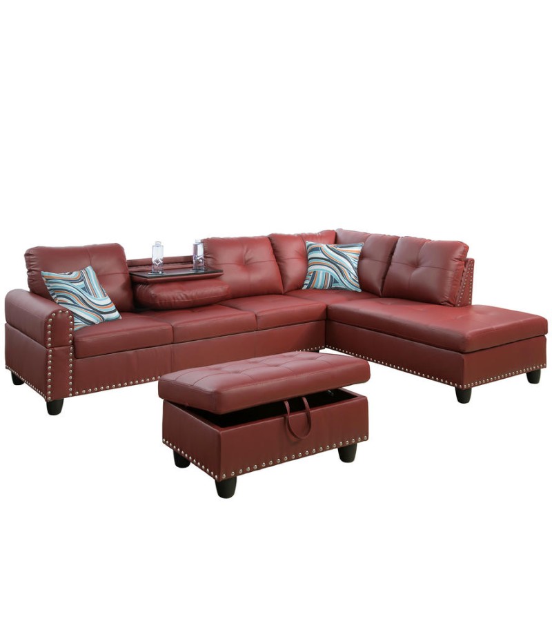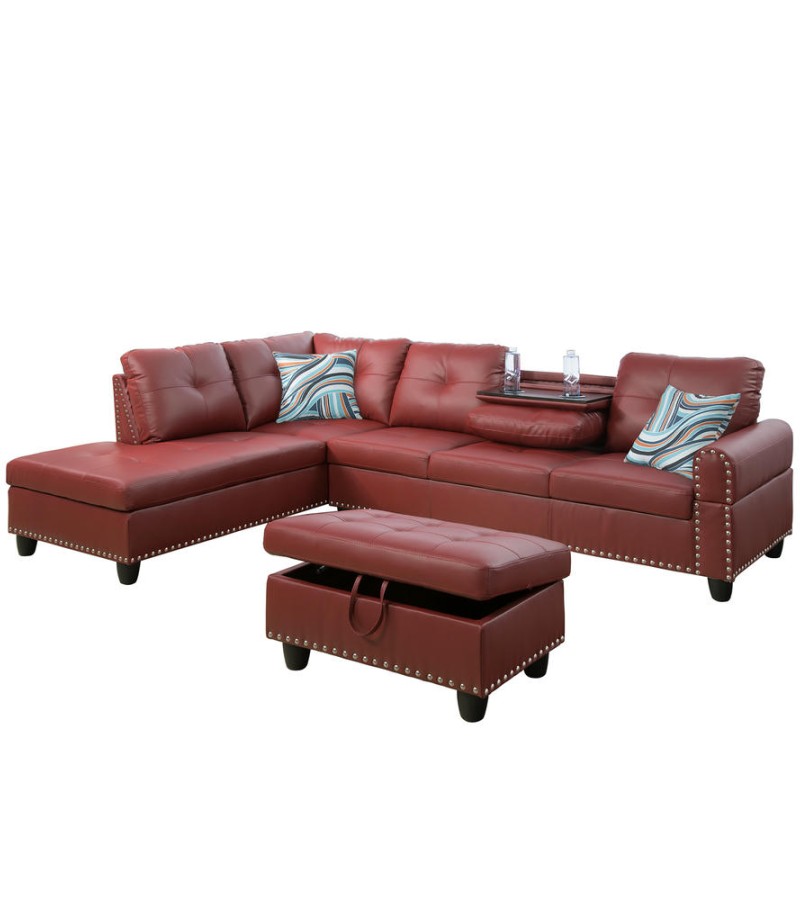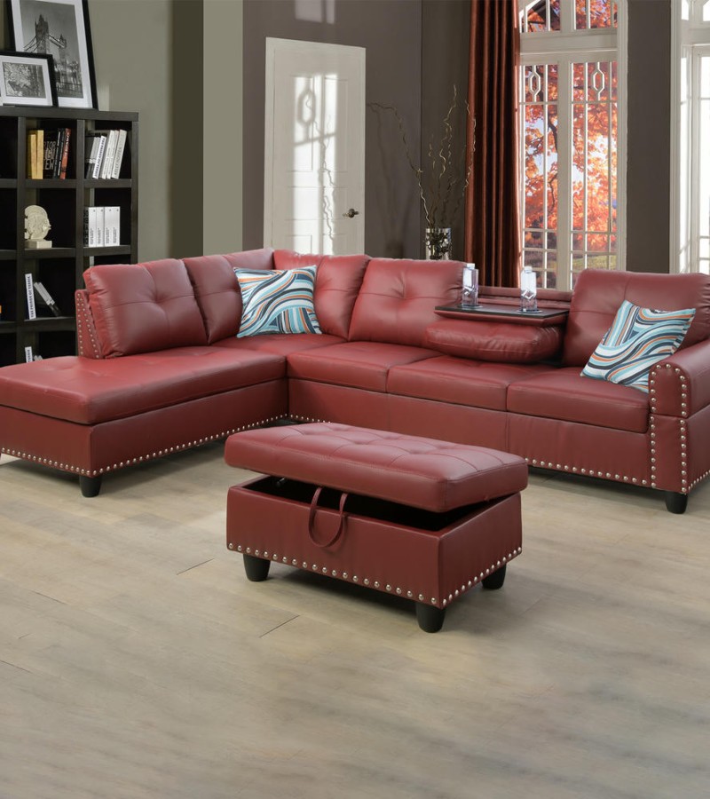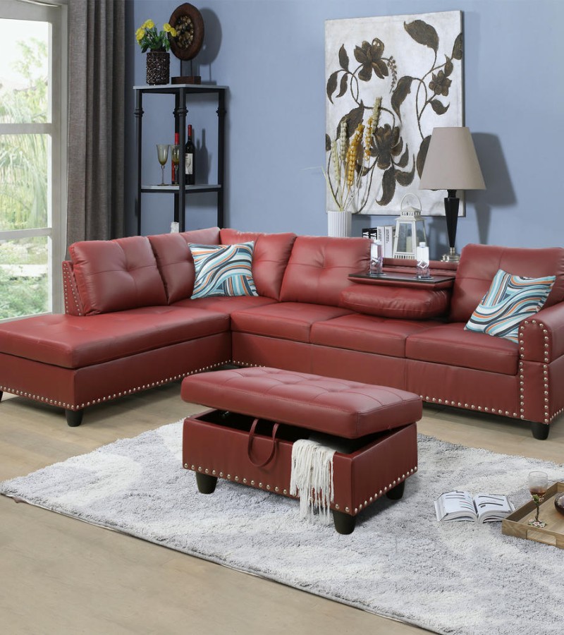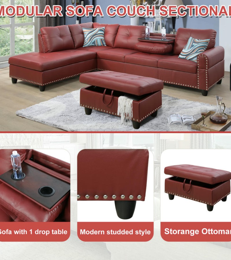 Ainehome Bold Red Faux Leather L-Shaped Sectional Sofa Set with Storage Ottoman and Nailhead Trim