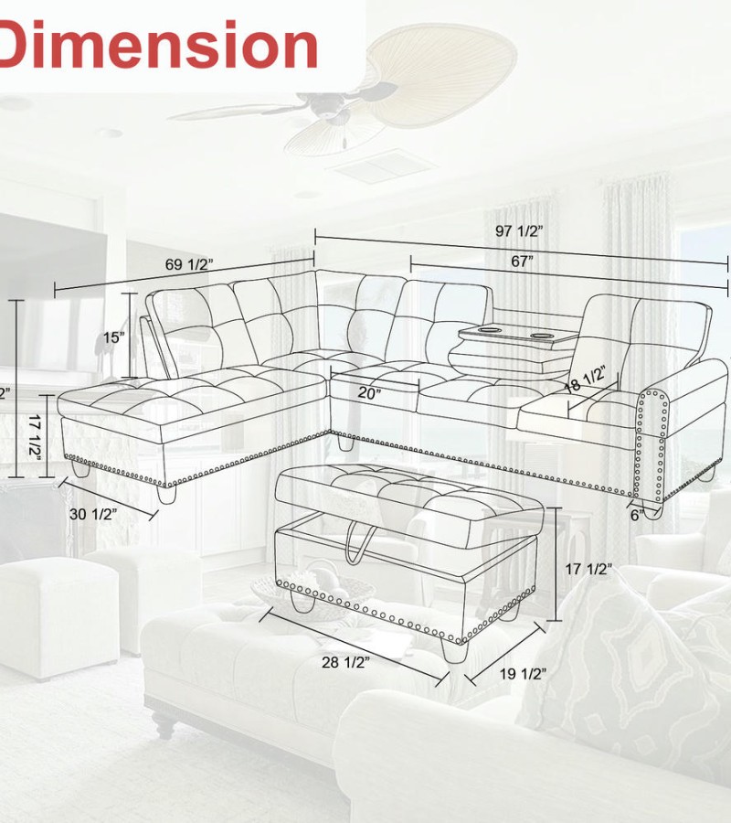 Storage Ottoman (O): 28.5"L x 19.5"D x 17.5"H